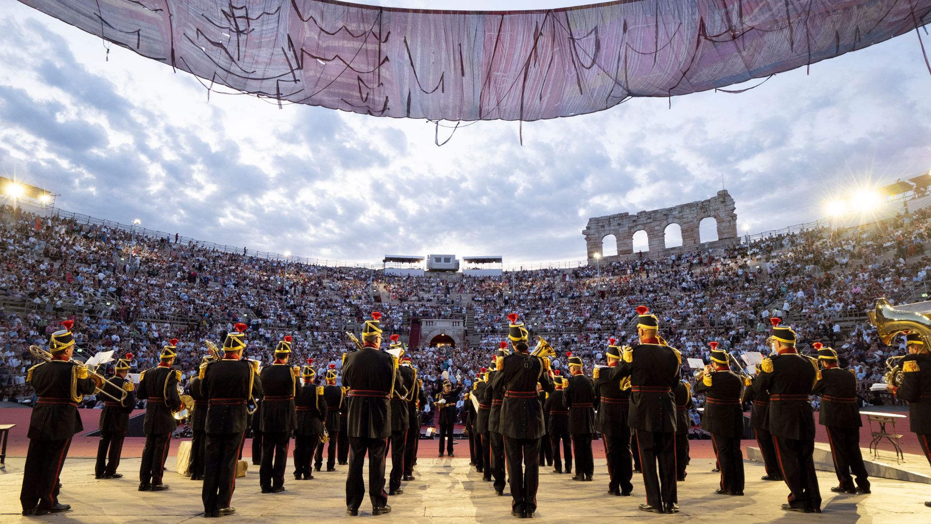 La banda musicale Vigili del fuoco sul dell'Arena di Verona Opera Festival prima di Carmen, 18 luglio 2025